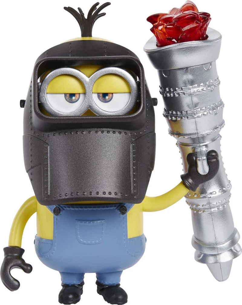 "Les Minions2: Il était une fois Gru" ("Minions: The Rise of Gru") est l'histoire de l'origine du super méchant le plus méprisable du monde! Joignez-vous à tout le plaisir de ce film espiègle avec des figurines de personnages clés et des actions amusantes activées par bouton. Kevin est vêtu de sa combinaison classique avec des outils de construction: 1réservoir d'essence fixé à son dos, 1masque de torche et 1lance-flammes. Il est armé et prêt à construire le repaire de Gru. En appuyant sur le bouton sur l'arrière de sa tête, il baisse le bras et lance une flamme. Pour encore plus de plaisir du film, choisissez aussi Stuart en tenue de kung-fu qui s'entraîne avec des nunchakus alors que son oeil les suit lorsqu'ils sont en mouvement, Bob Kung-fu qui frappe un gong qui tourne, Otto le motard qui lance la pierre du zodiaque et la regarde voler avec des yeux qui bougent, et Stuart qui lance une main collante pour s'entraîner à attraper la pierre sacrée. Ces figurines d'environ 10cm (4po) sont dotées d'un bouton d'action et de mains à prise universelle; la plupart ont des accessoires amovibles à échanger et partager. Toutes sont compatibles avec les assortiments Minions Bruyants et turbulents, Minions Moments de film et le véhicule télécommandé Wild Rider à même échelle pour maintenir l'humour et le plaisir des Minions. Chacune est vendue séparément, selon la disponibilité. Les couleurs, les motifs et les dimensions peuvent varier.