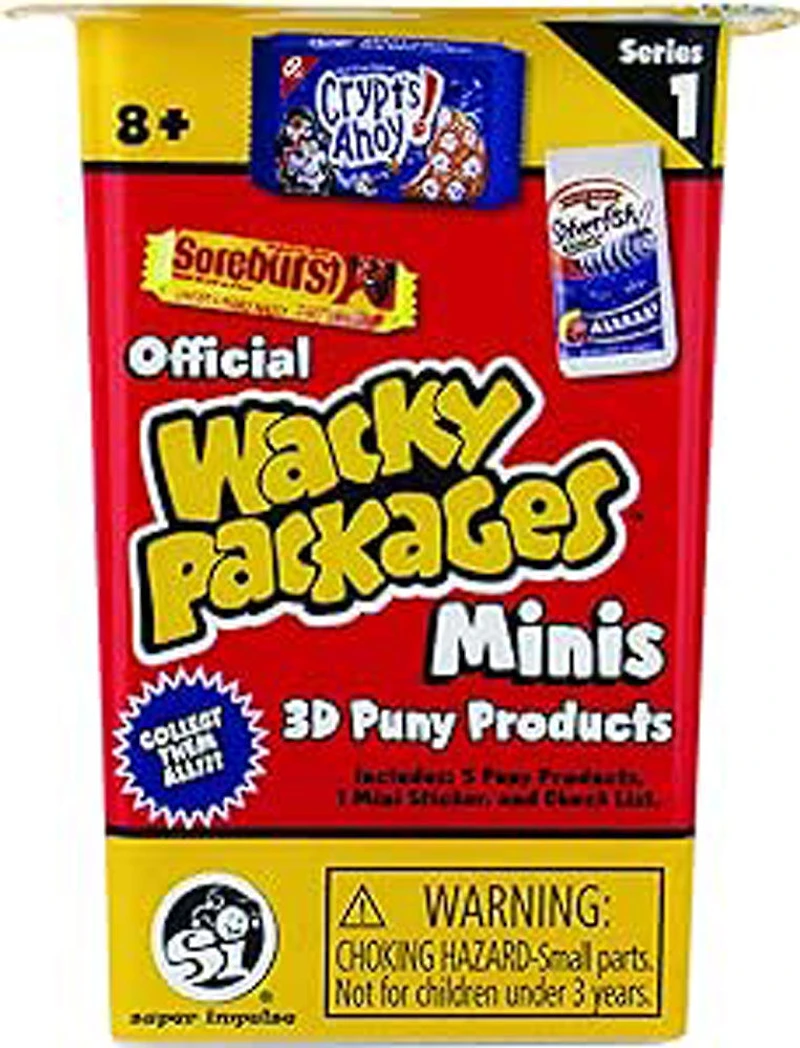 Wacky Packages Minis est une nouvelle ligne de produits hilarants, miniatures et en 3D, basés sur les autocollants classiques de l'emblématique société de cartes à collectionner Topps. Avec des parodies loufoques et scandaleuses de produits ménagers populaires, Wacky Packages Minis donne vie aux autocollants originaux en 2D en les transformant en jouets miniatures en 3D ! Chaque gobelet comprend : 5 minis paquets farfelus, 1 mini-autocollant et une liste de contrôle.
