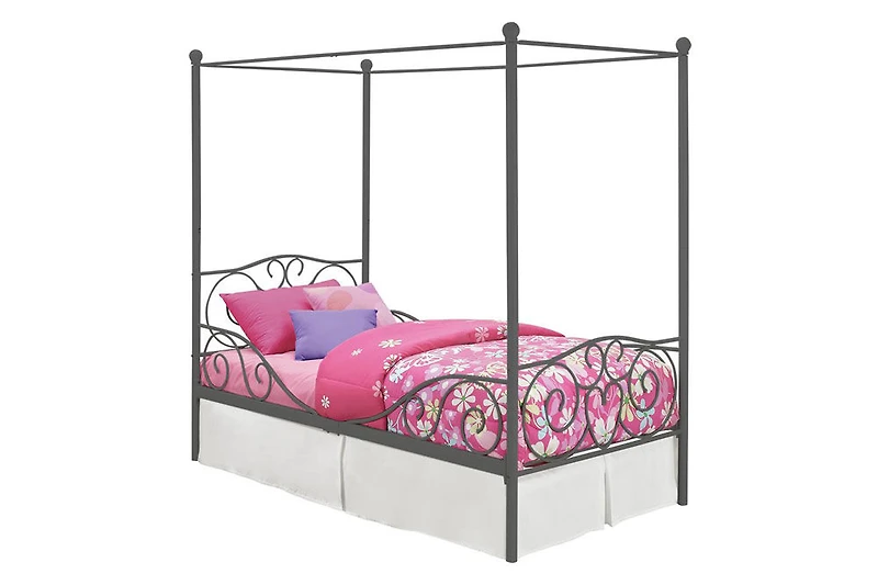 Rendez le moment de coucher plus alléchant avec le lit à baldaquin en métal de DHP. La conception à défilement de coeur embellie sur la tête de lit et le pied de lit évoque une allure élégante et amusante dans la chambre de votre princesse. Les quatre tiges de baldaquin, garnies de fleurons gracieux ajoutent la touche finale à cette pièce délicate. Mettez en évidence sa beauté encore plus en plaçant des voilages sur les tiges. L'effet en couches crée un endroit spécial où votre petite fille peut jouer et dormir. Conçu pour s'adapter à un matelas de lits jumeaux standard, ce lit comprend des lamelles métalliques qui éliminent le besoin d'un sommier à ressorts. Dimensions Assemblés: 77.5"P x 41.5"L x 71.5"H