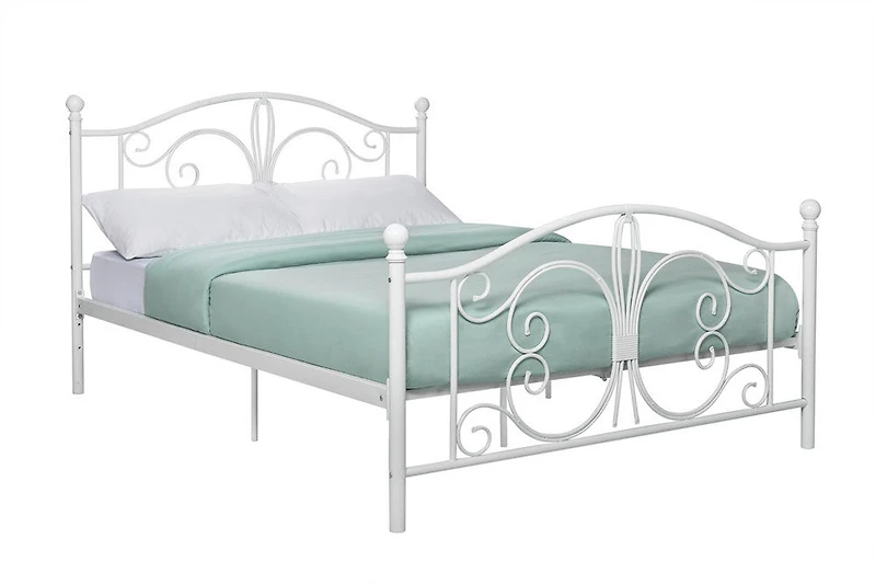 Ajoutez une touche d'élégance à votre chambre à coucher avec le lit en métal Bombay de DHP. La tête de lit et le pied de lit arbore des ornements floraux traditionnels et des colonnes à fleuron rondes offrent un look simple et classique à la fois. Doté de lattes et de pieds en métal, ce lit ne nécessite pas de sommier à ressorts ou de sommier superposé. Disponible dans une finition blanche qui s'adapte à une multitudes de décorations d'intérieur, le lit en métal Bombay de DHP sera l'élément central de votre chambre à coucher! Dimensions Assemblés: 77.5"P x 56.5"L x 41.5"H