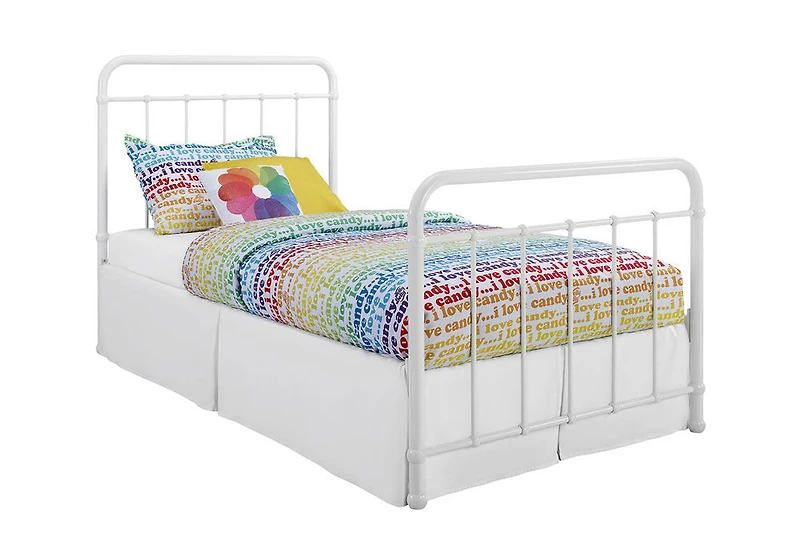 Le design intemporel du lit jumeau en fer Brooklyn de DHP est suffisamment polyvalent pour meubler une chambre des maîtres et une chambre d'enfant dans un style chic. Sa tête et son pied de lit incurvés présentent des lignes simples renforcées avec des accents métalliques décoratifs pour un look élégant.Un cadre métallique durable, des rails latéraux et des pattes de soutien garantissent la stabilité et la durabilité. Des lamelles en métal procurent un support supplémentaire pour le corps et le matelas. Pour votre commodité, ce lit a deux hauteurs de base - dégagement de 7" ou 11" - il peut donc être utilisé avec ou sans fondation. Dimensions Assemblés: 78"P x 42"L x 44"H