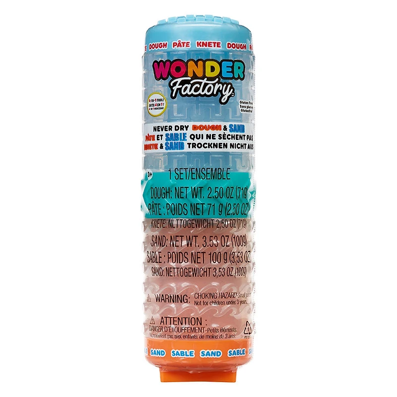 Procure une expérience amusante, imaginative et tactile aux possibilités infinies Comprend notre pâte et sable uniques Wonder Factory - ils ne sèchent jamais, sont sans gluten et sentent très bon ! OUTIL 4 EN 1 : 1. Abaissez-les ! 2. Timbrez-les ! 3. Reliez-les ! 4. Rangez-les ! Emballage réutilisable : Chaque contenant de pâte et sable ajoute à l'expérience de jeu avec des motifs, des timbres et bien plus encore ! Comprend 1 tube (3,5 oz) de sable, 1 tube (2,5 oz) de pâte, 2 bouchons avec des timbres amusants et 1 connecteur avec des motifs à rouler dans la pâte et/ou le sable. Voici le lot initial de pâte et sable jamais secs Wonder Factory ! Obtenez le meilleur des deux mondes avec notre pâte et notre sable qui sont sans gluten, sentent bon et restent souples pendant des heures et des heures de jeu imaginatif. Avec un grand choix de couleurs, les possibilités de s'amuser sont infinies !