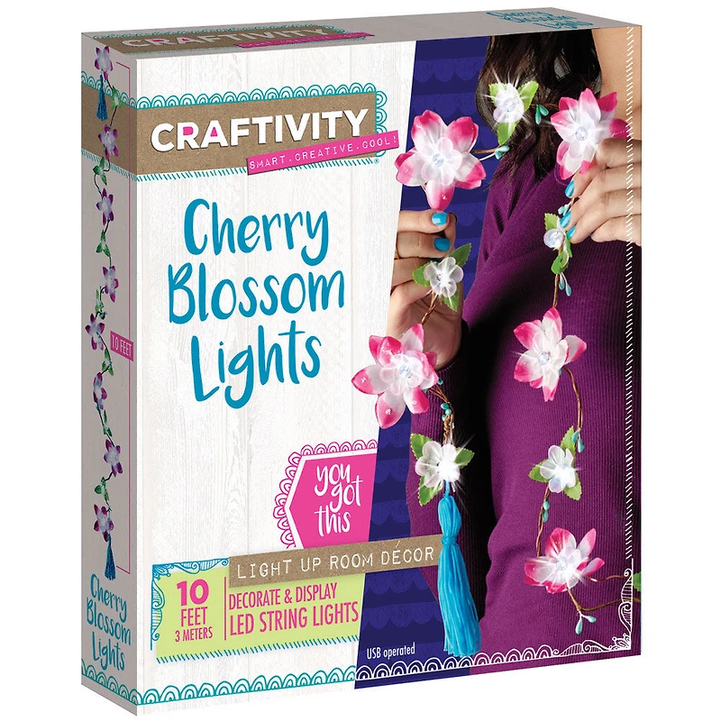 Combinez des fleurs de cerisier, perles, branches bourgeonnantes et accents étincelants pour créer un objet illuminé unique pour votre chambre. Ravissants glands en satin qui apportent la touche finale parfaite. 30 lumières DEL super brillantes fonctionnant par une prise USB - aucune pile requise. Lorsque terminé, le cordon de lumière mesure plus de 10 pieds de long. Vous n''avez qu''à le brancher pour créer instantanément de l''ambiance dans votre chambre.