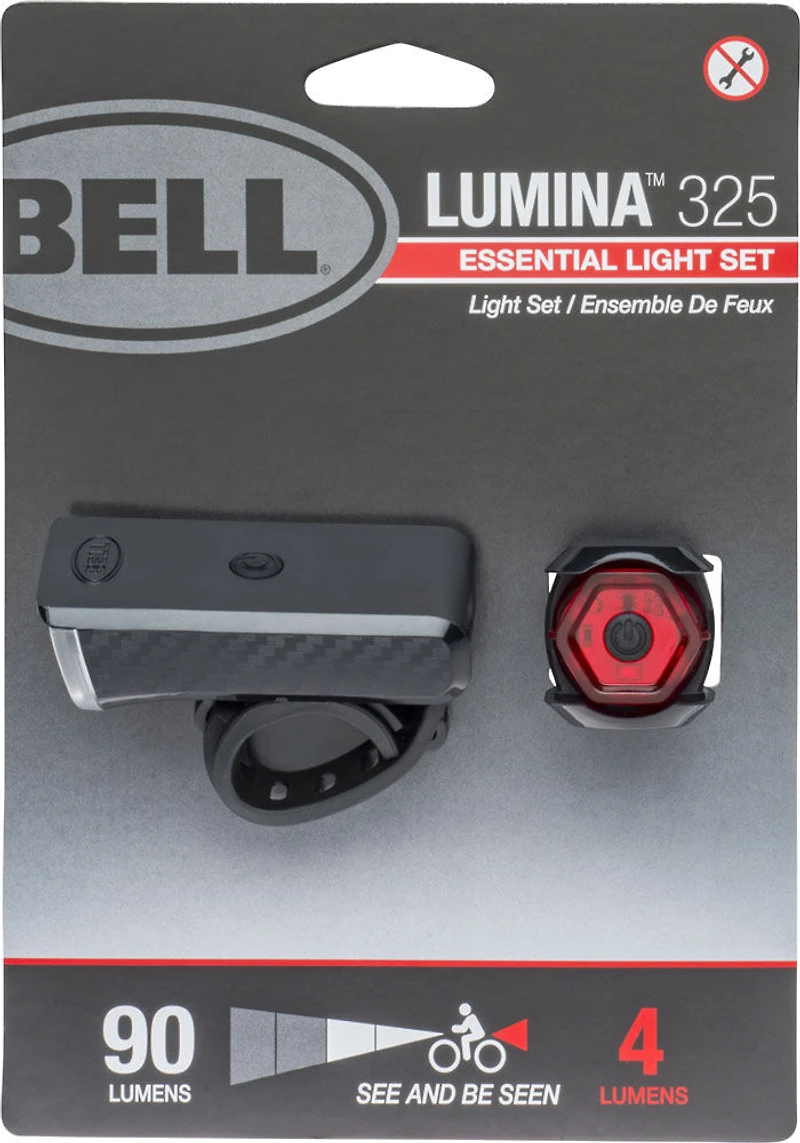 Le jeu d'éclairage Bell Lumina 325 vous offre une excellente visibilité à un prix avantageux, avec un phare de 90 lumens et un feu arrière de 4 lumens. Le phare utilise trois piles AAA pour une utilisation facile et une longue durée de vie. Le feu arrière utilise deux piles CR2032 incluses. Les deux lumières utilisent des sangles en silicone pour une installation facile sans outil.