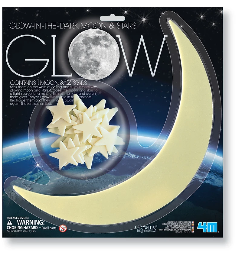 Apportez la beauté du ciel nocturne dans la chambre d'un enfant avec 4M Glow-In-The-Dark Moon and Stars. Décorez les murs et le plafond d'une chambre d'enfant avec ces objets en mousse souple qui brillent dans le noir. Cet ensemble comprend un (1) croissant de lune de 11,5 pouces et douze (12) étoiles assorties. L'adhésif pour fixer les étoiles est inclus. Parfait pour les jeunes passionnés d'espace, ou un enfant qui a hâte de dormir dans le noir. Recommandé pour les enfants de 3 ans et plus.