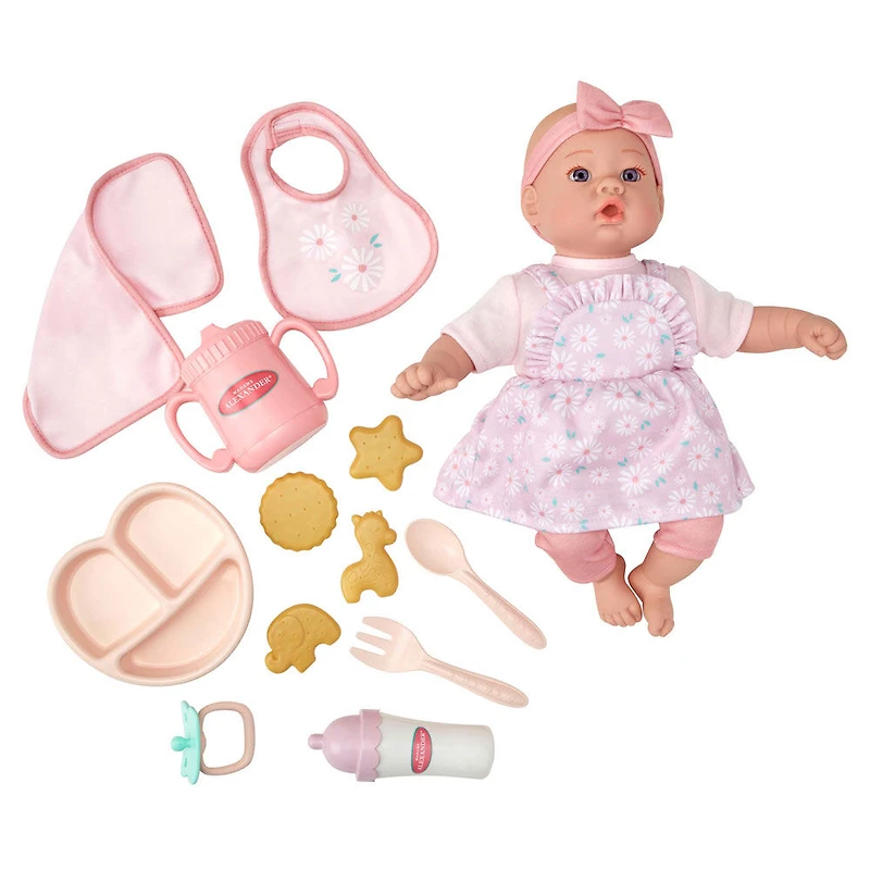 L'heure de la collation avec cet adorable poupon de 30,50 cm est tellement divertissant! Ce kit soigneusement imaginé est un cadeau idéal pour un enfant cher à votre coeur, encourageant des heures de jeux faisant appel à l'imagination et aux soins apportés à un bébé! Ce poupon a un corps souple et mou, un visage très réaliste aux jolis yeux fixes et des orteils délicats à chatouiller! Le poupon est vêtu d'une adorable robe chasuble avec un imprimé fleuri, d'un tee-shirt, et d'un bandeau. Le costume peut être retiré pour s'amuser. Le poupon vient aussi avec un assortiment d'accessoires pour l'heure de la collation : bavoir, protège-épaule, biberon, gobelet à bec anti-fuites, sucette, " petits gâteaux ", assiette avec compartiments, fourchette, et cuillère. 30,50 centimètres est une taille idéale de poupée pour les enfants âgés de deux ans et plus, favorisant le développement de la motricité fine et encourageant la gentillesse et la douceur à l'égard des autres. Les poupées de Madame Alexander sont créées avec de " l'amour dans les détails " si bien que votre enfant les chérira. Nos poupées réalistes de qualité supérieure sont faites pour être manipulées dans le cadre de jeux et pour être cajolées, de sorte que les enfants établissent des relations durables et profondes. Peu de caractéristiques interactives et des accessoires simples invitent les jeunes enfants à imaginer un univers qui est totalement le leur. Nos poupons sont faits pour être joués sans présenter de danger pour les enfants et en leur apportant un sens de bien-être ; leurs corps sont mous et les matières utilisées sont non toxiques. Nettoyez la poupée en l'essuyant avec un linge humide, séchez-la à l'air. Lavez les vêtements à la main ou en machine en choisissant le cycle " délicat ", faites sécher par culbutage à basse température.