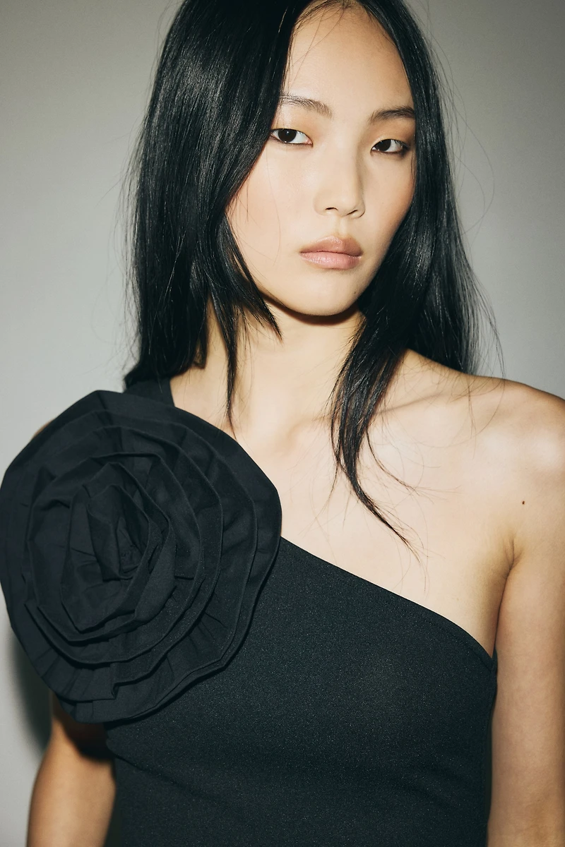 Maillot en jersey interlock épais. Modèle asymétrique avec une épaule nue et une bretelle large agrémentée d'un grand appliqué floral devant. Fond pressionné. Dos semi-couvrant.