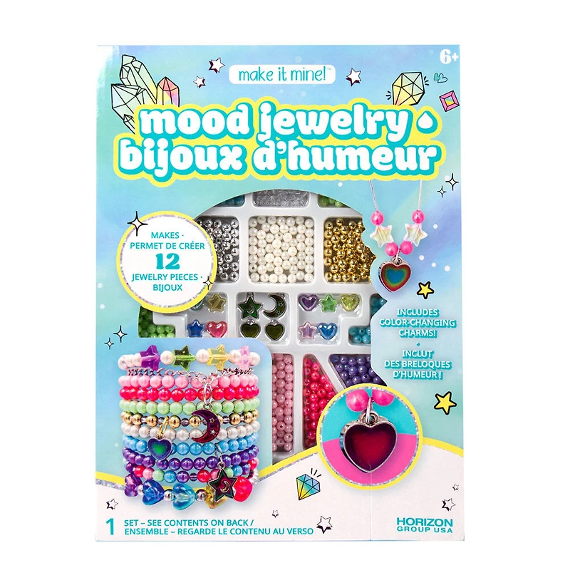 Avec le kit de bijoux d'humeur Make It Mine, exprime-toi en COULEURS! Avec 375 perles rondes, des perles en forme de coeur et d'étoile, du cordon élastique étincelant pour faire des bracelets, une chaînette pour faire un bracelet, et 4 ravissantes breloques d'humeur, ce kit nostalgique contient tous les articles essentiels pour créer plus de 12 bijoux inspirés par l'arrivée du nouveau millénaire. Comme à l'époque des jours de gloire, tes breloques changent de couleur en fonction de la température de ton corps! Est-ce qu'elles reflètent aussi ton humeur? Choisis parmi 3 motifs fabuleux - coeur, lune, ou étoile - et fais un joli collier perlé ou un bracelet orné de breloques. Fais-en quelques-uns pour tes meilleures copines ou porte un bracelet à chaque poignet! Ce kit constitue l'activité idéale pour une soirée-pyjamas ou une séance de loisirs créatifs et aide les enfants à développer leur motricité fine quand ils enfilent des perles. Recommandé pour les enfants âgés de 6 ans et plus.