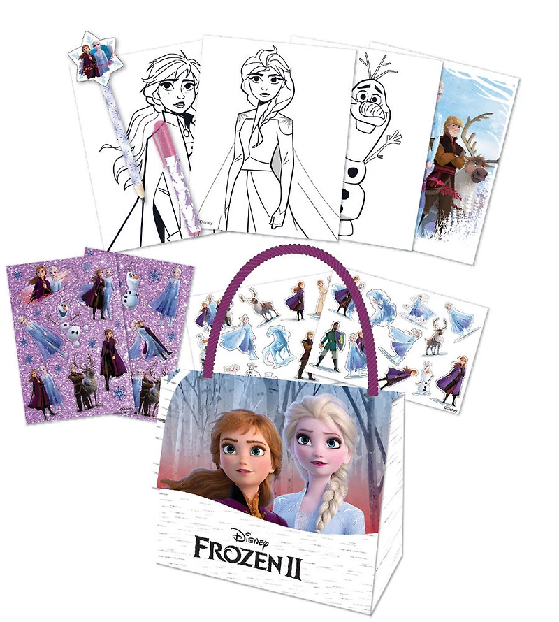 Mallette D'Activités La Reine Des Neiges En Forme De Sacoche. 2 feuilles d'autocollants régulières, 2 feuilles d'autocollants metallique, 1 mini stylo à paillettes, 1 crayon avec efface, un cahier de coloriage de 12 pages, un cahier de 30 pages