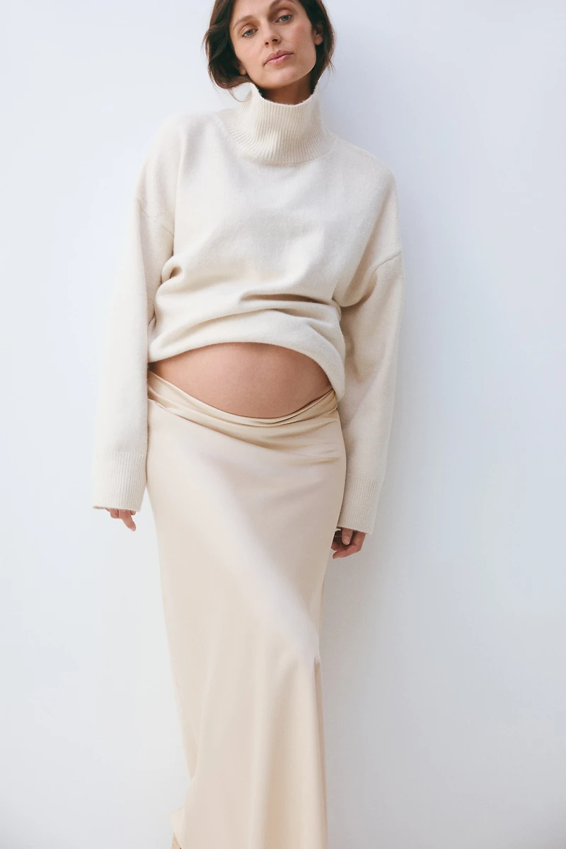 Jupe à mi-mollet en satin au tombé fluide de viscose mélangée. Modèle taille haute avec élastique dissimulé et pinces dans le dos pour plus de confort au niveau du ventre. Fermeture par agrafe et fermeture éclair dissimulées sur un côté. Non doublée.