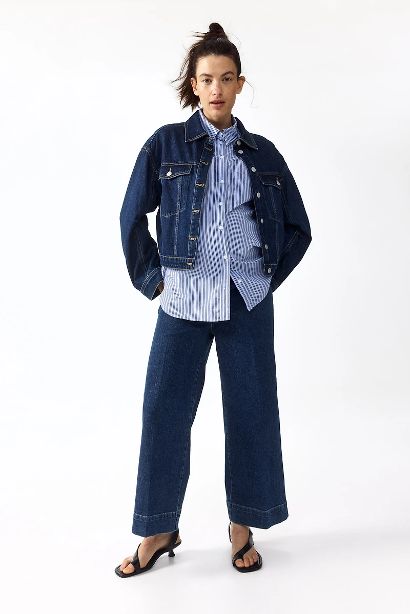 Jean en denim de coton enrichi d'une légère touche de matériau élastique pour plus de confort. Coupe classique de la taille jusqu'aux hanches avec jambes larges des cuisses jusqu'à l'ourlet. Modèle taille haute avec large bande de jersey à la taille pour un meilleur ajustement au niveau du ventre et élastique habillé de chaque côté. Fausse braguette surmontée d'un bouton. Poches dans le dos. Jambes avec plis marqués devant. Une longueur 7/8 conçue pour tomber juste au-dessus de l'os de la cheville.