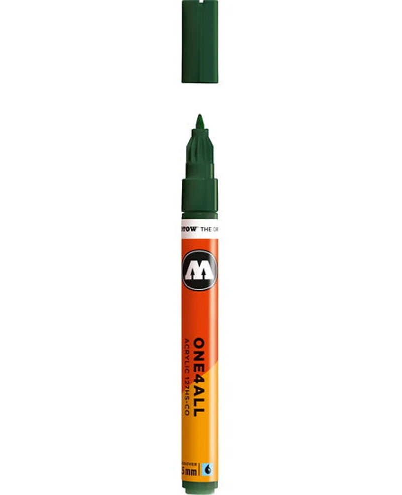 Les marqueurs One4All de Molotow sont conçus et fabriqués en Allemagne. L’encre acrylique de haute qualité est permanente, résistante aux UV, non toxique, et sèche rapidement. Elle peut être diluée avec de l’eau ou de l’acétone, et sèche en un fini opaque et semi-lustré sur presque toutes les surfaces poreuses ou non poreuses. Ils sont équipés d’un système capillaire breveté et d’une valve Flowmaster, qui offre un débit de peinture constant jusqu’à la pointe du marqueur. Conviennent à une utilisation intérieure et extérieure. Utilisez-les avec d’autres peintures en aérosol et marqueurs Molotow. Chaque marqueur peut être rempli au moins 50 fois avec les recharges de peinture One4All de Molotow, qui peuvent être mélangées pour créer la couleur de votre choix. Conseil : Les chiffres sur le côté de chaque marqueur (p. ex. 127, 327, 427, 627) indiquent la taille du baril, et donc la quantité de peinture que le marqueur peut contenir. La gamme Molotow One4All est écoresponsable comme tous les marqueurs sont réutilisables. De plus, les marqueurs et les peintures en aérosol utilisent la plus petite quantité de solvants possible, basée sur une peinture acrylique qui est composée à 85 % d'eau. L’emballage est respectueux de l'environnement et le fabricant a un programme de responsabilité sociale.