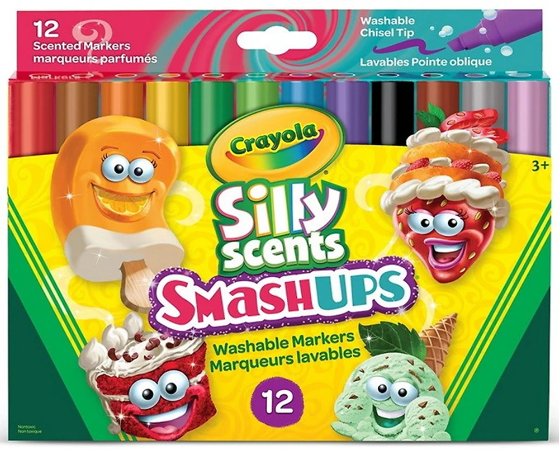 L’ensemble de 12 marqueurs Silly Scents à pointe oblique inclut 12 arômes : gâteau Red Velvet, macaron aux framboises, shortcake aux fraises, gâteau renversé, tarte à la lime, pépite de chocolat à la menthe, smoothie aux baies, sandwich au beurre d'arachides et guimauve, macchiato au caramel et Smores.