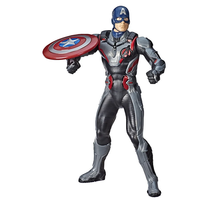 "Steve Rogers enfile un costume amélioré pour devenir Capitaine America, l'Avenger patriotique. On peut imaginer l'action incroyablement intense du monde des Avengers grâce aux figurines, articles de jeu de rôle et autres jouets inspirés du film Avengers : Phase finale! Ce film très attendu est le prochain chapitre de la franchise cinématographique des Avengers qui inclut Avengers : La Guerre de l'infini. La série de films des Avengers inclut des personnages populaires comme Capitaine America, Iron Man, Spider-Man, Black Widow, Thor, Hulk et Black Panther. Grâce aux jouets inspirés d'Avengers : Phase finale, les enfants peuvent imaginer combattre comme leur héros préférés et faire leur part pour sauver la galaxie! Cette figurine Capitaine America Lance-bouclier produit plus de 15 effets sonores et phrases du film Avengers : Phase finale de l'univers cinématographique de Marvel. Les enfants et les fans pourront actionner le mécanisme du lance-bouclier et imaginer le héros étoilé qui combat pour l'avenir de la galaxie aux côtés des autres Avengers. Copyright 2018 Marvel. Hasbro et tous les termes associés sont des marques de commerce de Hasbro. Inclus : figurine, accessoire et instructions. Figurine de 33 cm À partir de 4 ans MISE EN GARDE : Ne pas viser les yeux ni le visage. POUR ÉVITER TOUTE BLESSURE: N'utiliser que le projectile conçu pour ce produit. Ne pas modifier le projectile ni le lance-projectile. REQUIERT 1 PILE ALCALINE REQUISE. PILE DE DÉMO INCLUSE. VOIR LES INSTRUCTIONS. "