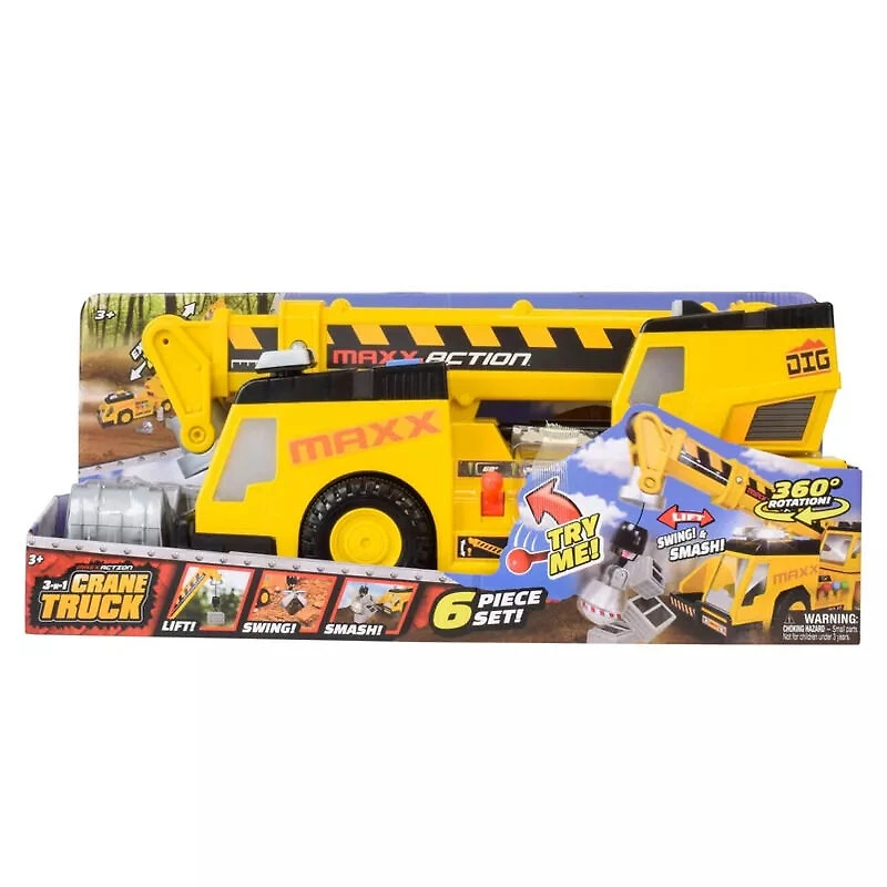 Emmenez le jeu à de nouveaux sommets avec le camion-grue 3-en-1 de Maxx Action ! Avec une grue massive de 27 pouces qui atteint des hauteurs de 30 pouces, ce camion de construction bourré d'action est prêt à affronter les aventures les plus difficiles. Les enfants peuvent utiliser les trois manettes de commande pour soulever, déplacer et fracasser tout au long de leurs aventures ! Les possibilités sont infinies lorsqu'ils empilent les briques de construction incluses en utilisant l'un des différents accessoires - pelle, crochet ou boule de démolition. Et quand vient le moment de voir à quelle vitesse ce camion peut aller, il suffit d'appuyer sur le bouton de marche avant ou arrière et de le regarder partir. Équipé de lumières clignotantes et de sons réalistes, les enfants se sentent comme s'ils étaient en plein milieu de l'action. Qu'ils prétendent construire des gratte-ciel ou démolir de vieux bâtiments, il n'y a pas de limite au plaisir qu'ils peuvent avoir avec le camion-grue 3-en-1 de Maxx Action.