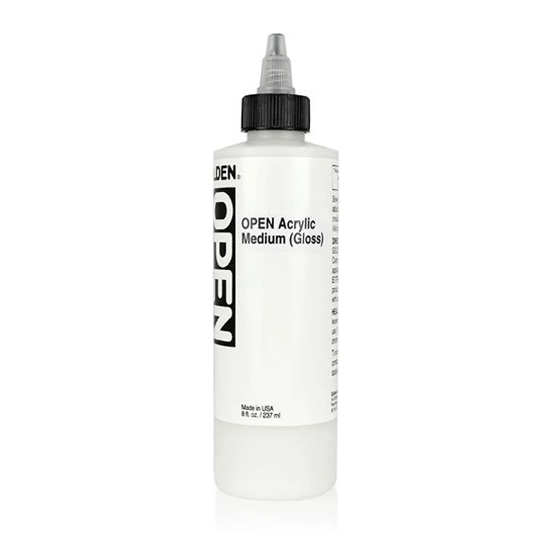 Le gel brillant Open est moins visqueux que la peinture acrylique Open et est utilisé pour maintenir les propriétés de la peinture, pour obtenir un mélange plus fluide et ainsi en faciliter l’écoulement. Mélangez une quantité de gel ou de médium avec l’acrylique Open afin d’étendre la peinture et de modifier son lustre, sa viscosité ou sa transparence.Les acryliques et médiums Open peuvent se travailler durant de longues périodes de temps, ce qui est tout indiqué pour les mélanges, pour obtenir des bords nets et pour le travail de détail.Tout au long du processus de création, la viscosité de la peinture passe par plusieurs étapes : dans un premier temps, sa consistance est la même que dans le tube, puis la peinture devient plus collante. Dans ce cas, l’ajout de produits Open ou d’eau sera nécessaire pour garder la consistance voulue et permettre de faire des mélanges aisément. La série Open a été conçue pour être utilisée en couches minces. Des applications de plus de 1/16 po entrainent un temps de séchage excessivement long, rend la peinture plus collante et les couches plus laiteuses. Pour appliquer de la peinture en couches épaisses, il est recommandé d’utiliser les acryliques Golden Heavy Body.Offert dans cette gamme :Diluant Golden Open : Diluant ralentisseur polyvalentGel brillant Golden Open : De même viscosité que les peintures Open