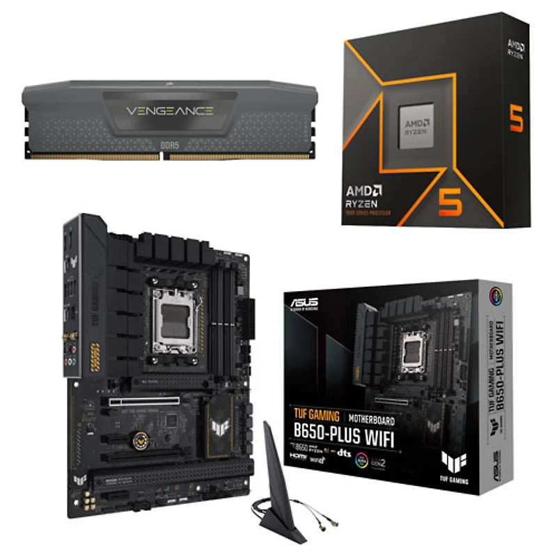 Profitez d'un traitement plus rapide et d'une performance améliorée grâce à cet ensemble pour ordinateur de bureau, qui comprend la mémoire vive Vengeance DDR5 6000 MHz de Corsair, le processeur Ryzen 5 9600X AM5 d'AMD et la carte mère Wi-Fi TUF Gaming B650-Plus d'ASUS.
