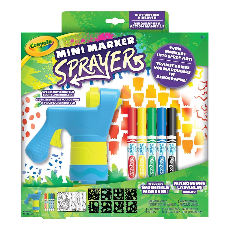 Préparez-vous pour une explosion de couleurs avec le pulvérisateur Mini Marker Sprayer Crayola! Cet aérographe à action manuelle est un moyen amusant de favoriser l'expression personnelle et la créativité de l'enfant. L'ensemble comprend 5 marqueurs lavables et peut également être utilisé avec tout marqueur Crayola ordinaire ou Pip Squeaks lavable. Le pulvérisateur est conçu spécialement pour les petites mains et ne nécessite pas de piles! Un cadeau de fêtes ou d'anniversaire idéal, ce jouet est sécuritaire pour les 6 ans et plus. L'ensemble comprend 2 pochoirs et 10 feuilles blanches, soit tout le nécessaire pour pouvoir jouer sans tarder!