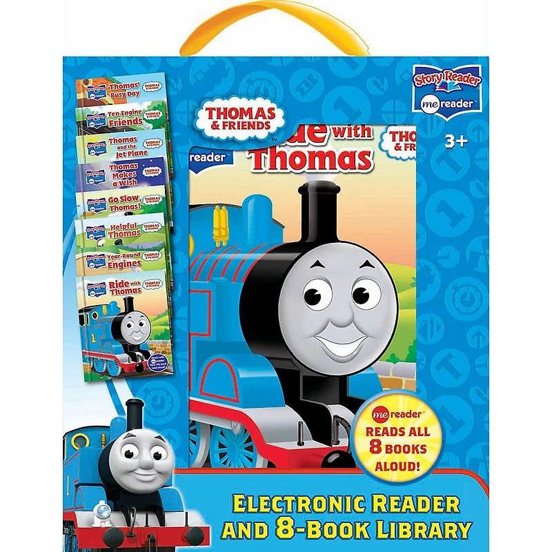 Ce merveilleux paquet de 8 livres de Thomas contient des titres tels que : Go slow Thomas (Va lentement Thomas), Year Round Engines (Locomotives qui dure toute l'année), Helpful Thomas (Thomas utile), Ride With Thomas (Faire un tour avec Thomas) et quatre autres. Chacun de ces livres comprend une narration et des effets sonores divertissants. L'enfant sélectionne le livre qu'il désire que le Moi Lecteur lise à voix haute en appuyant sur un bouton d'identification de livre. Ensuite, l'utilisateur ouvre le livre qui correspond à une double page et il appuie sur le bouton correspondant à l'identification de la double page sur le module pour entendre la lecture à voix haute du texte sur la double page.