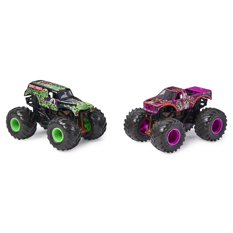 Monster Jam, Coffret de 2 monster trucks officiels en métal moulé Grave Digger vs Calavera qui changent de couleur, échelle 1:64