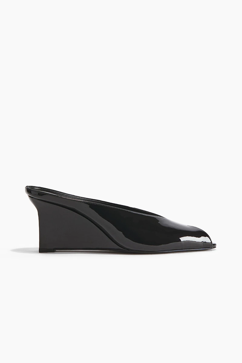 Mules en tissu enduit à la finition vernie. Modèle avec bout pointu agrémenté d'une petite ouverture et talon compensé habillé.
