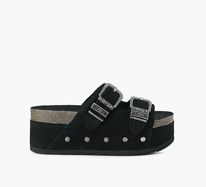 Avec le retour des silhouettes des années 90, il n’est pas étonnant que les sandales à plateforme fassent leur grand retour. Les sandales Mystic d’ASH en sont la preuve. Montées sur une semelle plate surélevée, elles présentent des brides supérieures ajustables ornées de boucles imposantes. Sans oublier leur design ponctué de rivets, apportant une touche bohème-chic à toutes vos tenues.