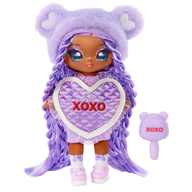 JOLIE POUPÉE-MANNEQUIN AUX CHEVEUX VIOLETS : Eva Evermore a une magnifique chevelure violette avec de longues tresses. Utilisez la brosse incluse pour coiffer ses cheveux à maintes reprises ! TOUT EST DANS LES DÉTAILS : Eva a un visage imprimé et des détails sur ses vêtements. Elle porte un bonnet pelucheux avec des oreilles dotées d'un joli coeur à l'intérieur, un tee-shirt court, une robe matelassée en forme de coeur garni d'un volant et une inscription brodée " XOXO ", des chaussures fermées à lanières et une brosse en forme d'ourson avec un dicton assorti et inspiré du coeur. DOUCE ET ARTICULÉE : Elle est douce et aime les câlins et elle est également articulée pour pouvoir l'exposer ! ARTICLES INCLUS : Poupée-mannequin de 19 cm (7,5 po), bonnet, robe en forme de coeur, tee-shirt court, chaussures et brosse moulée. Le bonnet n'est pas amovible. EXCELLENT CADEAU : Offrez-la à un être cher, sans aucune raison. Cette charmante poupée inspirée d'un ourson fera la joie de bien des enfants. Elle est idéale pour plusieurs occasions, comme la Saint-Valentin, les anniversaires, Pâques ou un prompt rétablissement. Célébrez une personne spéciale avec style grâce à la toute nouvelle poupée-mannequin Na Na Na Surprise de la série Sweetest Hearts ! Vous obtenez une poupée-mannequin douce en plus d'une brosse assortie avec des charmants dictons inspirés du coeur ! Chaque poupée a une adorable robe matelassée en forme de coeur, un bonnet ourson et des chaussures à thème assorties ! Les poupées Na Na Na Surprise sont les toutes premières poupées-mannequins douces et articulées avec un visage imprimé et des détails de mode. Maintenant présentées dans un emballage ouvert pour montrer tous les détails de qualité, il sera plus facile que jamais de toutes les collectionner ! Eva Evermore est accompagnée d'une étiquette avec son nom, sa date de naissance et quelques informations sur elle. La série Sweetest Hearts comprend 6 adorables poupées-mannequins douces à collectionner, aux couleurs préférées des enfants. Les poupées-mannequins douces et les jouets Na Na Na Surprise sont conçus pour les collectionneurs et les enfants, les filles et les garçons de 5 à 10+ ans qui sont passionnés de la mode, fervents des animaux et qui aiment l'amitié, tout ce qui est fabuleux et confortable, doux et duveteux, y compris les jouets en peluche, les surprises et de charmantes oreilles d'animaux sur tout ! En tant que cadeaux d'anniversaire et cadeaux pour toute occasion spéciale, les poupées élégantes et pelucheuses Na Na Na Surprise, les jeux de poupées magnifiques et les accessoires mignons procurent des heures de jeu social et imaginatif avec les frères et soeurs et les amis ! De MGA Entertainment, créateurs des poupées-mannequins et poupées de collection LOL Surprise, des poupées-mannequins Rainbow HighMC, des poupées-mannequins Na Na Na Surprise, des poupées-mannequins BratzMD, des poupées-mannequins MGA's Dream EllaMC, des poupées MGA's Glitter BabyzMC, des poupées LalaloopsyMC, des poupées et objets de collection Baby BornMD Surprise, des jouets Little TikesMD pour enfants et de nombreuses autres marques préférées.