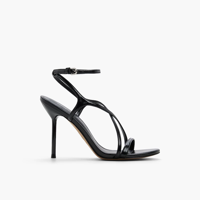 Nalanii en noir ne fait pas dans la discrétion. Brides minimalistes croisées, talon aiguille élancé et bride à la cheville pour une silhouette qui allonge la jambe. Classique, mais avec attitude.