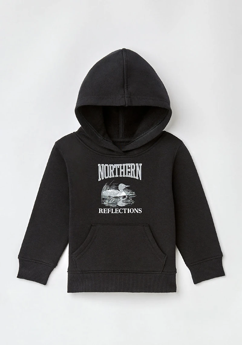 Un chandail à capuchon douillet pour enfants mettant en vedette le huard emblématique de Northern Reflections. Conçu avec un intérieur en molleton doux, des poignets et un ourlet côtelés ainsi qu’une poche kangourou pratique, c’est une pièce patrimoniale pensée pour le confort et la chaleur au quotidien.