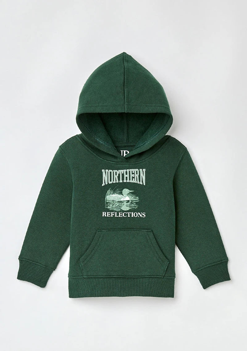 Un chandail à capuchon douillet pour enfants mettant en vedette le huard emblématique de Northern Reflections. Conçu avec un intérieur en molleton doux, des poignets et un ourlet côtelés ainsi qu’une poche kangourou pratique, c’est une pièce patrimoniale pensée pour le confort et la chaleur au quotidien.