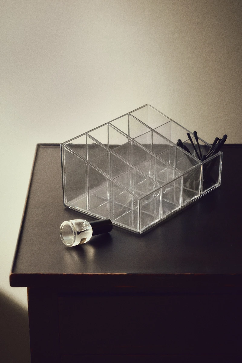 Organiseur à maquillage en plastique avec 12 compartiments. Modèle avec séparateurs verticaux mobiles vous permettant d'adapter l'espace de rangement à vos besoins.