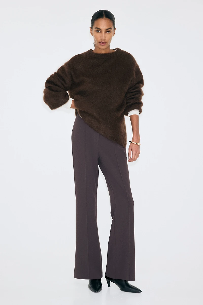 Pantalon en jersey épais. Modèle taille haute avec élastique dissimulé, ceinture prolongée munie d'un bouton et d'une fermeture par agrafe et barrette dissimulées, et braguette à fermeture éclair. Jambes coupe bottillon avec plis piqués devant.
