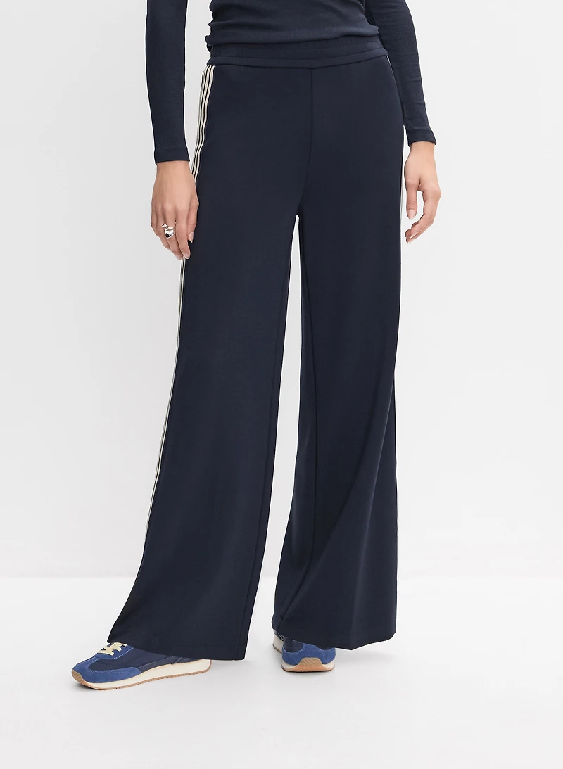 Renouvelez votre garde-robe du weekend avec notre pantalon relaxé à jambe large. À porter avec la veste coordonnée. Taille mi-haute Style à enfiler Taille froncée élastique Jambe large Bandes latérales contrastantes Matière douce et extensible Entrejambe : 31 po