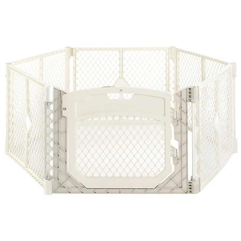 Parc indépendant Superyard à 6 panneaux pouvant servir à créer un espace fermé sûr de 18,5 pi2 au plus pour jouer Porte ultralarge facile d'accès pouvant être ouverte à une main et qui est dote d'un double mécanisme de verrouillage, pour une sécurité accrue Construction entièrement en plastique rendant le Superyard léger, facile à bouger et convenable à l'intérieur et à l'extérieur Pour mettre le Superyard dans des espaces restreints, sachez que 2 des 6 panneaux peuvent être enlevés pour créer un espace de jeu carré à 4 panneaux Installation et pliage facile, sans outil; Facile à transporter, à déplacer et à ranger quand vous n'en avez pas besoin Comprend une sangle de transport et des patins antidérapants Peut être agrandi avec la trousse d'extension à 2 panneaux (vendue séparément), ce qui augmente la surface de jeu à 34,4 pi2