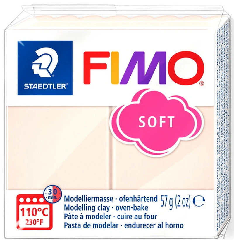 Staedtler Fimo soft est extrêmement facile à pétrir et prête à l’emploi en un rien de temps, ce qui rend cette argile idéale pour toute la famille! Cette pâte à modeler aux couleurs vives peut être mélangée avec FIMO Classic et FIMO Effect. Les idées créatives peuvent être modelées en très peu de temps. Nécessite la cuisson au four. Soyez inspiré par le grand éventail de couleurs et découvrez votre créativité! Les 24 couleurs peuvent transformer les objets du quotidien en pièces tendance uniques. Caractéristiques :Pâte à modeler souple, douce et prête à l’emploiMélange facile : modelage amusant pour toute la familleCouleurs vibrantesBloc standard divisé en 8 segments pour morcellement facile56 g (55 mm x 55 mm x 15 mm)Disponible en 24 couleursLes couleurs FIMO sont miscibles entre elles et l’argile peut être coupée, percée, colorée, peinturée et sablée. Notes importantes : Cuire au four à 130 °C/230 °F pendant 30 minutesSe laver les mains après usageConvient aux enfants 8 ans et plus, sous la supervision d’un adulteNe jamais dépasser le temps de cuisson suggéréNe jamais cuire au micro-ondes