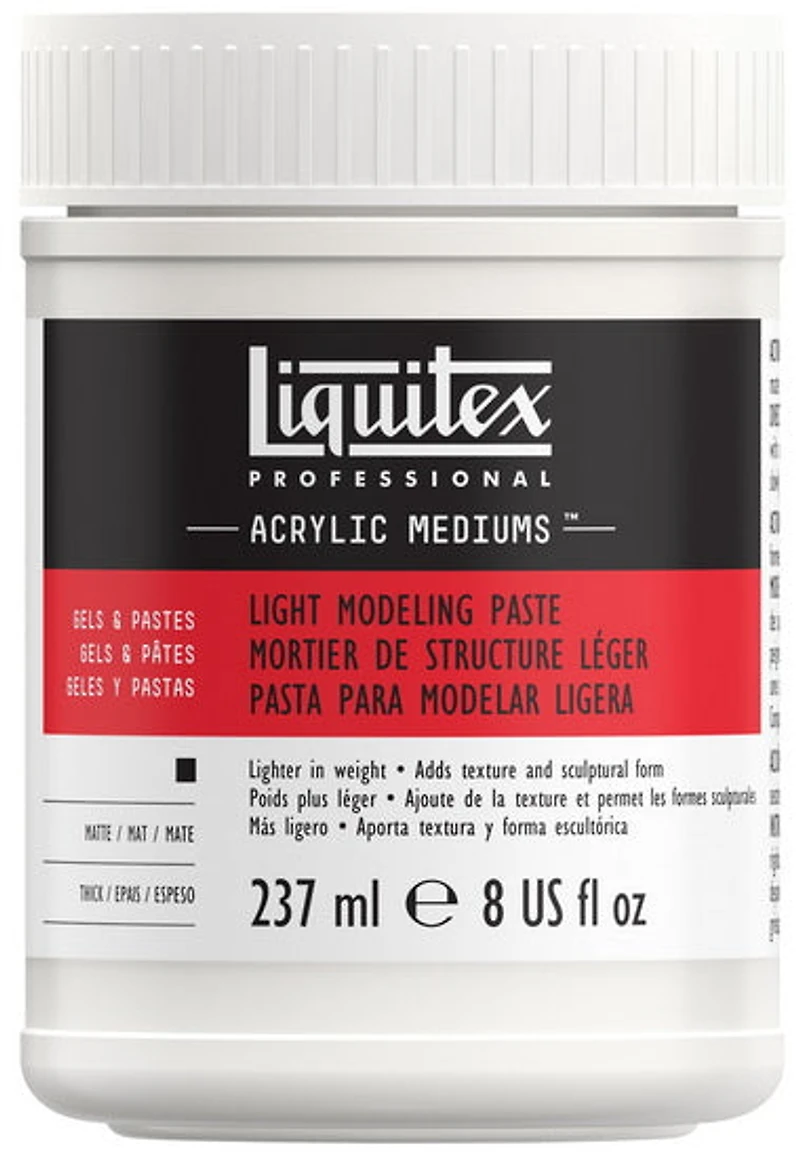 De consistance épaisse et au rendu mat et opaque, le mortier de structure légère Liquitex sèche lentement et donne une surface très dure. Il peut être travaillé au couteau de peintre lorsque humide, poncé, sculpté et peint une fois sec. Il se mélange aux autres gels texturés et médiums pour créer un éventail de textures.En vente en formats de 8 oz/237 ml, 16 oz/475 ml et 32 oz/946 ml. Supports : convient à tous supports rigides.Informations pratiques :Ne pas mélanger avec de l’huile.Apparition de craquelures si application sur une surface flexible. Faire un essai avant l’utilisation.Utilisations :Textures épaisses sur supports rigides.