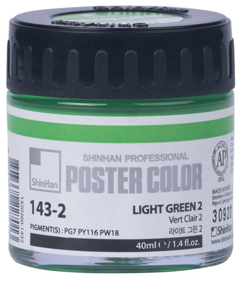 Les couleurs pour affiches Shinhan sont universellement populaires depuis de nombreuses années grâce à leur opacité, leur polyvalence et leurs couleurs vives. Après des années de recherche et de développement, Shinhan a créé une gamme de peinture d’affiches remarquable, de qualité professionnelle et pour les artistes utilisant la gomme arabique comme agent de liaison. Les artistes, concepteurs et illustrateurs qui créent des affiches aux allures nostalgiques qui semblent provenir d’une époque révolue apprécient les qualités inégalées de cette peinture professionnelle. Les couleurs sont soigneusement formulées avec une teneur élevée en pigments purs, finement moulus et d’excellente qualité. Les commentaires des artistes témoignent de la luminosité inégalée, la saturation élevée et l’excellent pouvoir couvrant de cette peinture. Celle-ci s’écoule facilement, sèche rapidement et uniformément pour créer un fini mat et opaque. La peinture d'affiche de qualité professionnelle Shinhan est maintenant offerte dans une gamme de 69 couleurs.La peinture d'affiche de qualité professionnelle Shinhan est résistante au crayon et d’une consistance crémeuse, sèche rapidement et est lavable sur la peau et la plupart des tissus. Cette peinture convient pour une variété de pinceaux et de surfaces non graisseuses, y compris le verre, le papier mâché et l’argile.Quantité : 40 mlPigments purs finement moulus Teneur élevée en pigments de la plus haute qualitéLuminosité inégalée et saturation élevéeExcellente opacité et pouvoir couvrantÉcoulement facile, séchage rapide et uniforme, fini mat et opaqueConvient sur toutes les surfaces non graisseuses y compris le verre, le papier mâché et l’argile