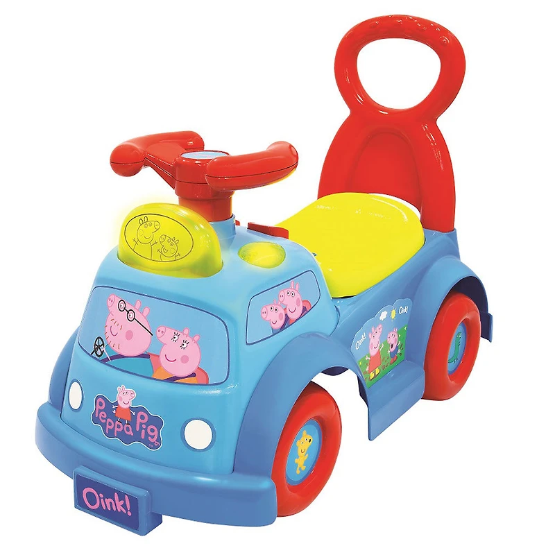 Joignez-vous à Peppa et la famille entière sur le Véhicule avec lumières et sons de Peppa Pig. Ce véhicule-porteur comprend des expressions originales de Peppa Pig et des lumières et effets sonores qui sont facilement activés par un bouton. Votre enfant demeurera stable lors de sa promenade grâce au volant facile à saisir et l’empattement large. Un rangement commode sous le siège et une barre de poussée sont aussi inclus pour compléter ce véhicule-porteur adorable et amusant.