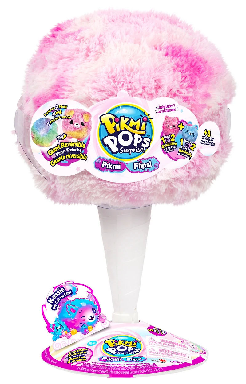 Une peluche parfumée réversible géante : un pompon qui devient un Pikmi géant. Collectionnez les 3 Pikmi Flips géants inspirés de la barbe à papa : le lapin, le chat et le chien! Trouvez 1 ou 2 peluches Pikmi parfumées et réversibles cachées à l'intérieur! Découvrez les 8 articles surprises! Collectionnez-les et portez-les! Accrochez votre Pikmi préféré à votre sac, à votre cahier de notes, à votre poche et plus! Voici les nouveaux Pikmi Flips géants. Une peluche parfumée réversible, un pompon géant qui devient un Pikmi géant en un flip! Cet ensemble Pikmi Flip comprend 1 peluche géante réversible, 1 peluche parfumée réversible*, 2 messages surprises, 1 cordon, 8 articles surprises et un guide du collectionneur. Il y a 3 Pikmi Flips géants inspirés de la barbe à papa à collectionner. Cinnabun le lapin, Kessie le chat et Eddie le chien. *Le paquet pourrait contenir une peluche parfumée réversible, un message secret et un cordon de plus en prime. La liste des surprises comprend : Petites étiquettes, crayons gel, feuille de tatouages temporaires, cahier de notes et étiquettes pour sac.