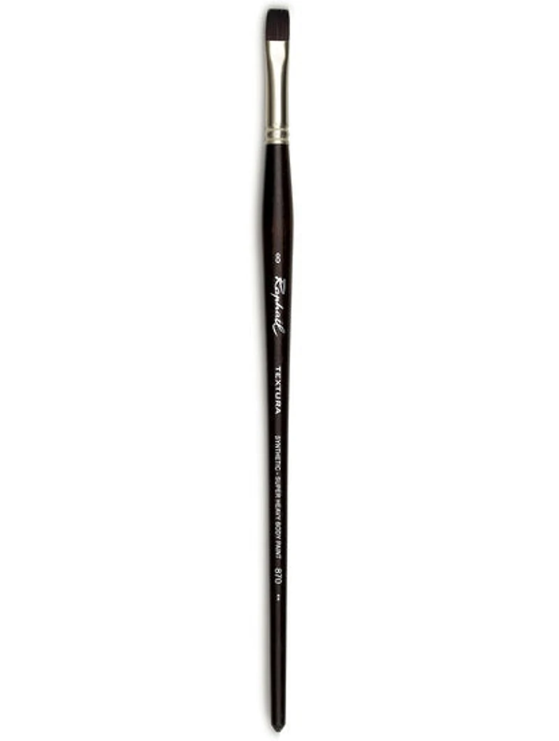 Pinceau plat en poils synthétiques avec un long manche teinté ébène. Idéal pour la peinture acrylique, les détails, les contours et les retouches.Textura = Nervosité + Résistance. L'outil idéal pour les peintures épaisses. La gamme de pinceaux Textura est destinée aux artistes qui peignent en empâtement et souhaitent créer des effets de relief avec des acryliques épais et gels de structure. Ces brosses, constituées de fibres synthétiques courtes, rigides et très résistantes, offrent une excellente réponse sur le support.Virole : laiton nickelé matLong mancheRaphaël fabrique des pinceaux depuis 1793.Entretien L’entretien est une étape essentielle pour prolonger la durée de vie de vos pinceaux et les garder en bonne condition.Aquarelle : tremper dans l’eau et rincer à l’eau tiède.Huile : tremper dans un solvant, nettoyer à l’eau savonneuse et rincer à l’eau tiède.Acrylique : nettoyer à l’eau savonneuse et rincer à l’eau tiède.Informations pratiques :Ne jamais laisser sécher avant le nettoyage. L’utilisation d’un nettoyant à pinceau hydratant après l’usage du solvant ou du savon prévient l’assèchement des poils et préserve leur souplesse.