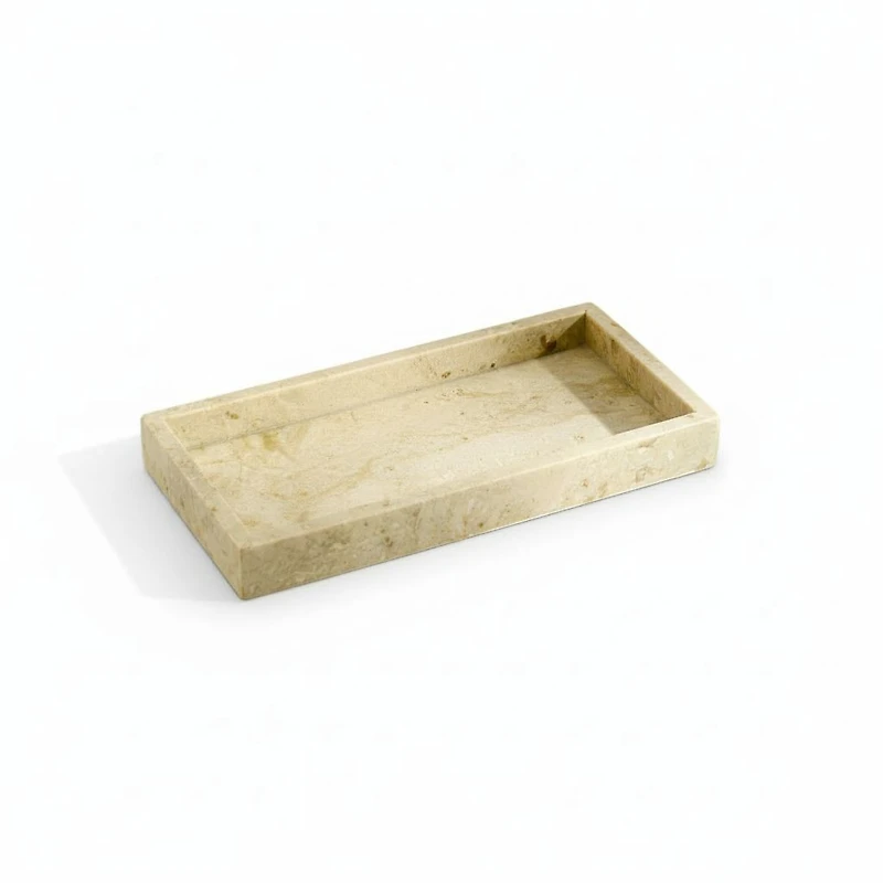 Le plateau en marbre, avec sa silhouette rectangulaire et ses bords soigneusement relevés, incarne l'élégance et la fonctionnalité dans chaque détail. Conçu pour servir une gamme variée d'utilisations, sa taille est parfaitement adaptée pour disposer des