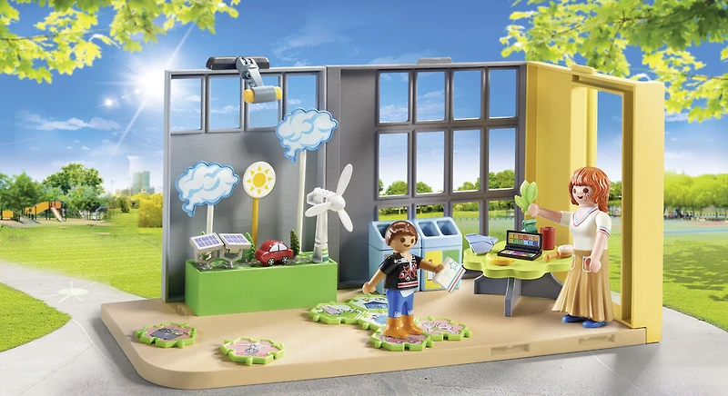 The toy set contains a PLAYMOBIL figure, a climate model, a table, four trash cans, a pencil, a paint box, a puzzle with climate protection tasks and many other extras for creative role play. The playset can be played with on its own or combined with the Large School (71327 - sold separately).