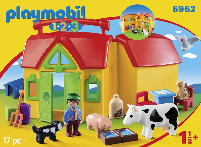 Prends soin des animaux de la ferme avec la Ferme Transportable avec Animaux PLAYMOBIL 1.2.3. Remplis les abreuvoirs des vaches et les auges des cochons, distribue le foin et caresse le chat perché sur le dossier de la chaise. Trie le sac, le tonneau et le cageot dans les compartiments à l'intérieur de ta boîte, mais prends garde car chacun a sa propre forme! A la fin de la journée, rentre les animaux pour la nuit avec l'aide de ton fidèle chien de berger. Joue avec ton imagination! Idéal pour emporter partout avec soi, les pièces du jeu peuvent être rangées et transportées dans la ferme. Comprend une ferme transportable, une figurine, un chien, un chat, un cochon, une vache, un oiseau, des abreuvoirs, un sac, un tonneau, un cageot, une fourche, une niche, et plein d'autres accessoires. Avec ses couleurs vives et formes rondes, ce jouet PLAYMOBIL 1.2.3 est spécifiquement conçu pour les petits.