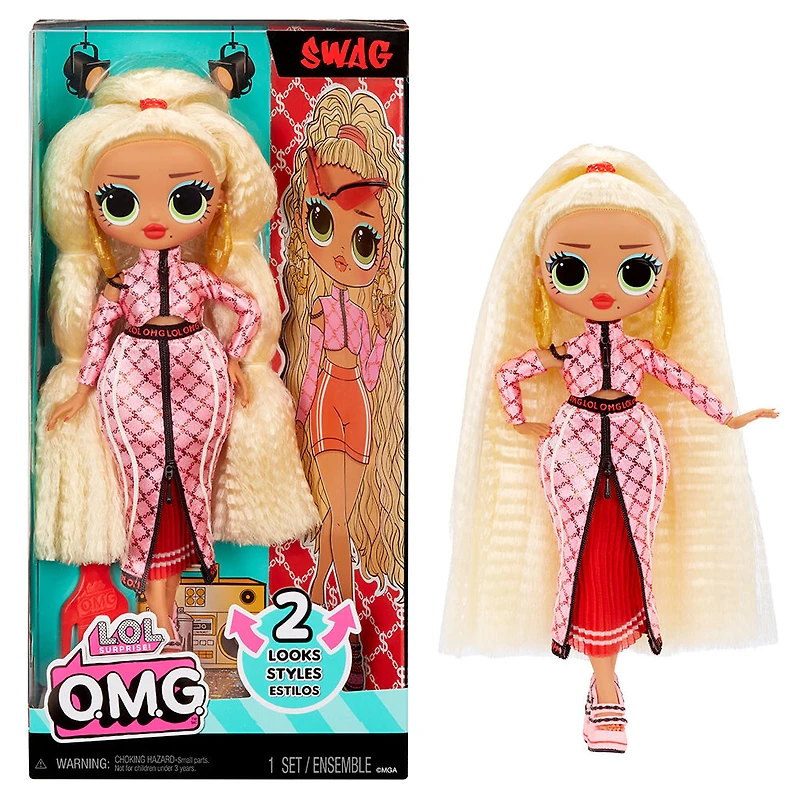 Les poupées-mannequins originales L.O.L. Surprise O.M.G. préférées des fans sont de retour dans de toutes nouvelles tenues glamour et de magnifiques coiffures : dites bonjour à Swag, grande soeur de la superstar, M.C. Swag ! Swag captive toutes les foules avec son style chic et sa personnalité cool qui s'accorde parfaitement avec ses meilleures amies ; elle aime suivre le courant et garder les choses au calme ! Déballez de multiples surprises incluant des articles mode transformables et de fabuleux accessoires allant des lunettes de soleil tendance aux jolies créoles pour mettre en évidence son style urbain ! Habillez Swag avec son haut rose avec fermeture éclair et manches avec motifs assortis et une magnifique jupe longue qui peut être fermée et ouverte par le haut et le bas pour révéler un tissu très fin en dessous ! Découvrez la surprise supplémentaire des articles mode de Swag en retirant sa longue jupe pour révéler un joli short rouge en dessous, transformant instantanément sa tenue en un style complètement différent ! Cette remise en vente de Swag met en valeur ses magnifiques traits, ses jolis cheveux, sa belle tenue et Swag est articulée pour lui faire pendre une foule de poses différentes. Chaque boîte comprend une poupée-mannequin L.O.L. Surprise O.M.G., de superbes tenues, des accessoires détaillés, des chaussures et un peigne à cheveux ! Collectionnez les 4 poupées L.O.L. Surprise O.M.G. remises en vente : Swag, Neonlicious, Lady Diva et Royal Bee ! Conseil de pro : Les mains sont amovibles pour faciliter l'habillage.