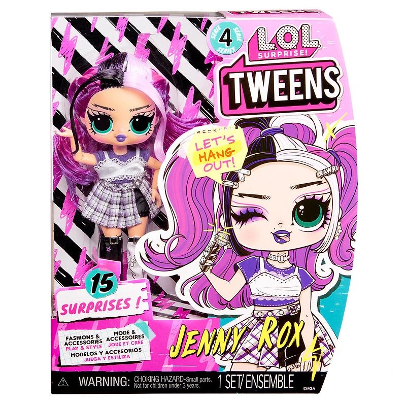 Voici la toute nouvelle poupée-mannequin L.O.L. Surprise Tweens, Jenny Rox, grande soeur du personnage adoré, Roadie ! Déballez 15 surprises et préparez-vous à vous démarquer sur la scène avec Jenny Rox dans sa tenue de vedette pop et ses cheveux de rockeuse, qui se produit avec son micro glamour ! Non seulement sa voix puissante captive le public, mais sa tenue punk comprend des jambières élégantes, une jupe-culotte à carreaux tendance et un haut chic superposé ! Elle a de superbes traits, une belle chevelure, un style fabuleux et elle est articulée pour de nombreuses possibilités de poses. Chaque boîte comprend une poupée-mannequin L.O.L. Surprise Tweens, des articles mode fabuleux, des chaussures, des accessoires, des barrettes, des boucles d'oreilles, un sac à main, un microphone, une brosse à cheveux et un socle de poupée. Collectionnez toutes les poupées-mannequins L.O.L. Surprise Tweens de la série 4 : Jenny Rox, Ali Dance, Olivia Flutter et Darcy Blush.