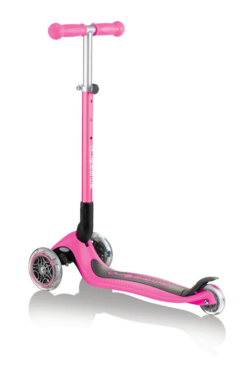 NOUVEAU Scooter pliable Primo! La série Primo offre désormais une valeur ultime avec son système de pliage intégré sécurisé et breveté avec un bouton-poussoir simple. Mode chariot compatible. Le nouveau design de plateau composite plus large offre plus de stabilité, le frein composite extra-long et large prolonge la longévité de la roue et le guidon réglable en hauteur sur 3 est facile à utiliser avec une pince. Le bouton de verrouillage de la direction breveté empêche le système de direction des deux roues avant de ne bouger que vers l'avant et vers l'arrière. Recommandé pour les enfants de 3 à 6 ans et plus, supporte jusqu'à 50 kg. Existe en bleu marine, vert lime et rose vif.