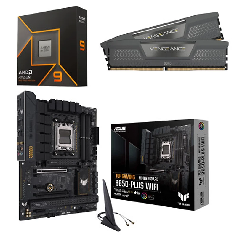 Donnez plus de puissance à votre ordinateur de bureau grâce à cet ensemble, qui comprend le processeur Ryzen 9 9950X AM5 d'AMD, une mémoire vive Vengeance de 32 Go de Corsair et une carte mère de jeu Wi-Fi TUF B650-Plus d'ASUS.