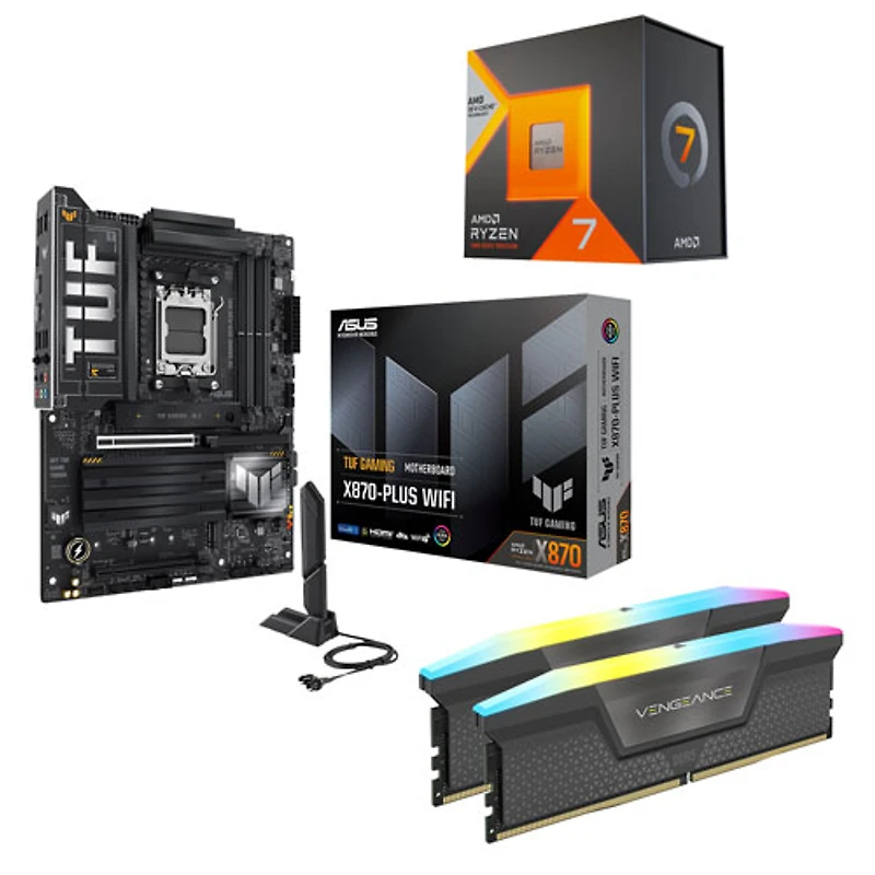 Améliorez la performance de votre ordinateur de bureau grâce à cet ensemble, qui comprend le processeur Ryzen 7 7800X3D d'AMD, la mémoire vive Vengeance RGB de 32 Go de Corsair et la carte mère ATX TUF X870-PLUS d'ASUS.