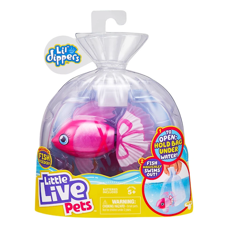 Bellerive est un P'tit plongeur de Little Live Pets qui adore nager et afficher ses magnifiques nageoires! Découvrir ce superbe poisson hors de son emballage est une expérience magique! Tenez le sac qui contient Bellerive sous l'eau et à mesure que le sac se remplit, ce fabuleux poisson s'anime et nage hors du sac en exhibant ses élégantes nageoires! Les mouvements de Bellerive sont si réalistes lorsqu'elle fait joliment onduler sa queue et ses nageoires colorées! Chaque P'tit plongeur est offert avec une bouteille magique d'aliments pour que vous puissiez interagir avec votre poisson. Regardez Bellerive nager en direction de la bouteille pour se nourrir. Bellerive a des caractéristiques de ballerine : sa queue et ses nageoires élégantes flottent gracieusement comme un ruban. Il y a 3 P'tits plongeurs à collectionner, chacun avec des caractéristiques différentes qui révèlent leur personnalité! Plongez dans l'univers des P'tits plongeurs et découvrez un monde à la fois aquatique et exotique!