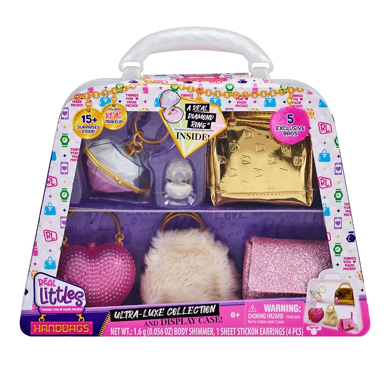 Entourez-vous de styles époustouflants remplis de surprises de luxe avec la collection et la vitrine Real Littles Ultra-Luxe Handbags! Cette élégante collection de 5 micro-sacs à main exclusifs est l'accessoire parfait à emporter partout et a l'air tout aussi incroyable sur sa vitrine de sac à main exclusive ! Fabriqués avec des matériaux et des finitions Ultra-Luxe, ces sacs à main inspirés des créateurs sont pleins de micro-surprises élégantes ! Il y a tellement de choses à trouver et à adorer, le tout avec une touche de luxe. Des téléphones et étuis de téléphone glamour, des stylos, des pochettes et des ensembles de lettres aux vrais sacs de maquillage et cosmétiques et plus encore ! Il y a plus de 15 surprises à découvrir ! De plus, chaque collection Ultra-Luxe comprend une véritable bague en diamant (cultivée en laboratoire) ! Les sacs à main de la collection Real Littles Ultra-Luxe sont l'accessoire parfait pour ajouter un peu de luxe et de sophistication à n'importe quelle tenue. Clipsez-les sur votre cartable, votre sac à main ou même votre boucle de ceinture et adoptez votre style ! Les vrais petits sont des " choses que vous aimez faites micro !